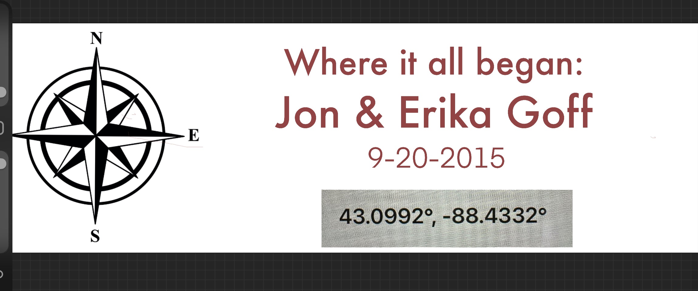 On the left hand side of the plaque engrave and inlay with wood a compass rose ( see picture).  Sean - Do not use any fancy fonts. Katy prefers simple straight lined text such as in picture.  Also, see sizing of fonts in picture.  See exact latitude and longitude lines in degrees, per picture.   The latitude font was copied in from Word document (for illustration only).  Font size will be appropriate to plaque.